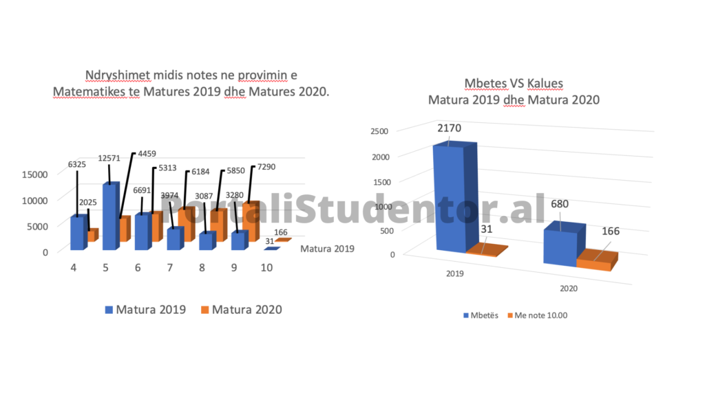 Ajo që bën më shumë përshtypje, është fakti që në provimin e matematikës të Maturës 2019, nota e cila u mor më shumë në provim ishte nota 5, ndërkohë që në provimin e Maturës 2020, po kjo notë ishtë nota 9. Vihet re edhe raporti midis personave që kanë ngelur në provim, si edhe ata që kanë marrë 10.00.